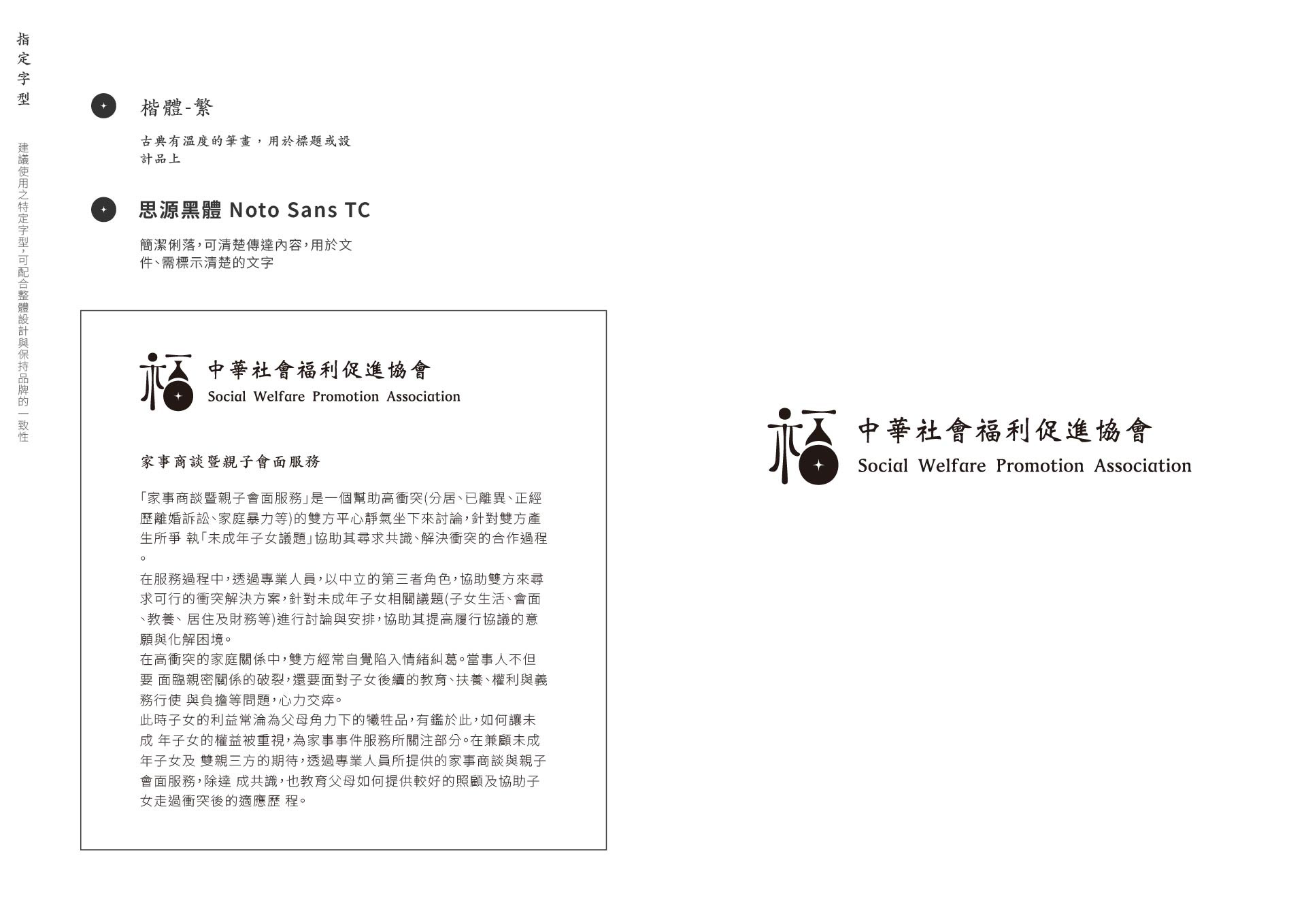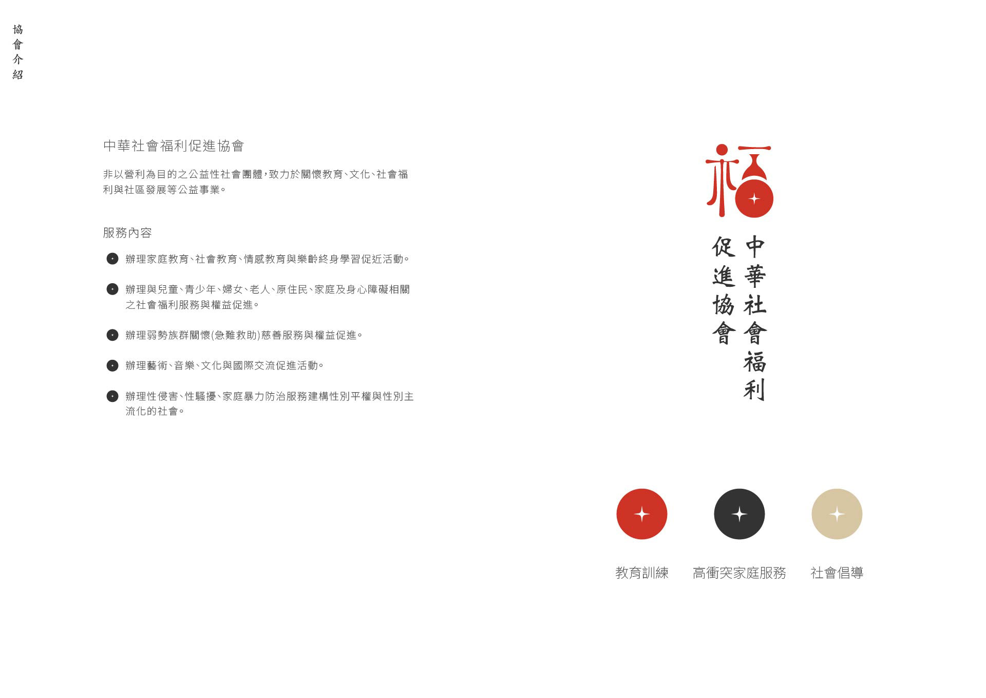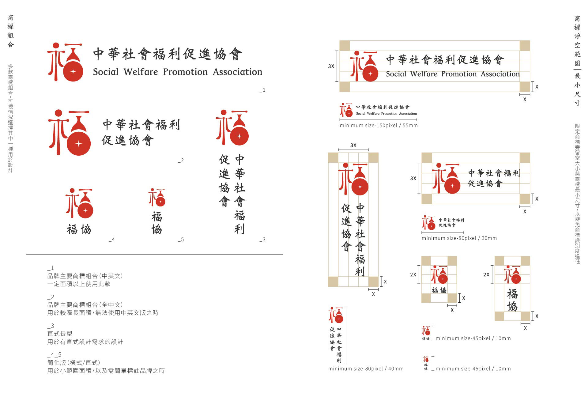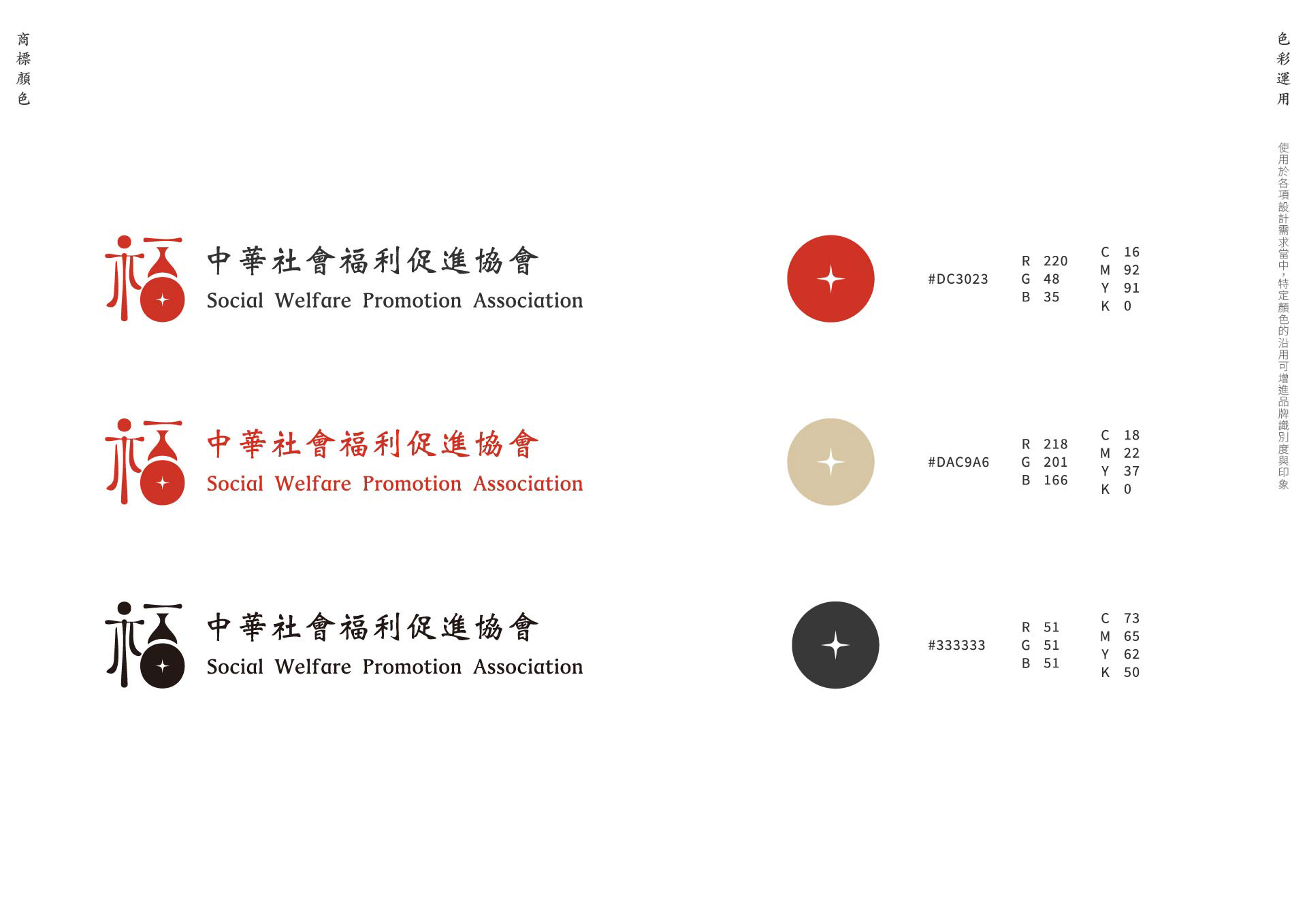 「中華社會福利促進協會」是非以營利為目的之公益團體。其商標運用主要在文件的印刷上,相較於商業品牌,其調性更接近政府體系。